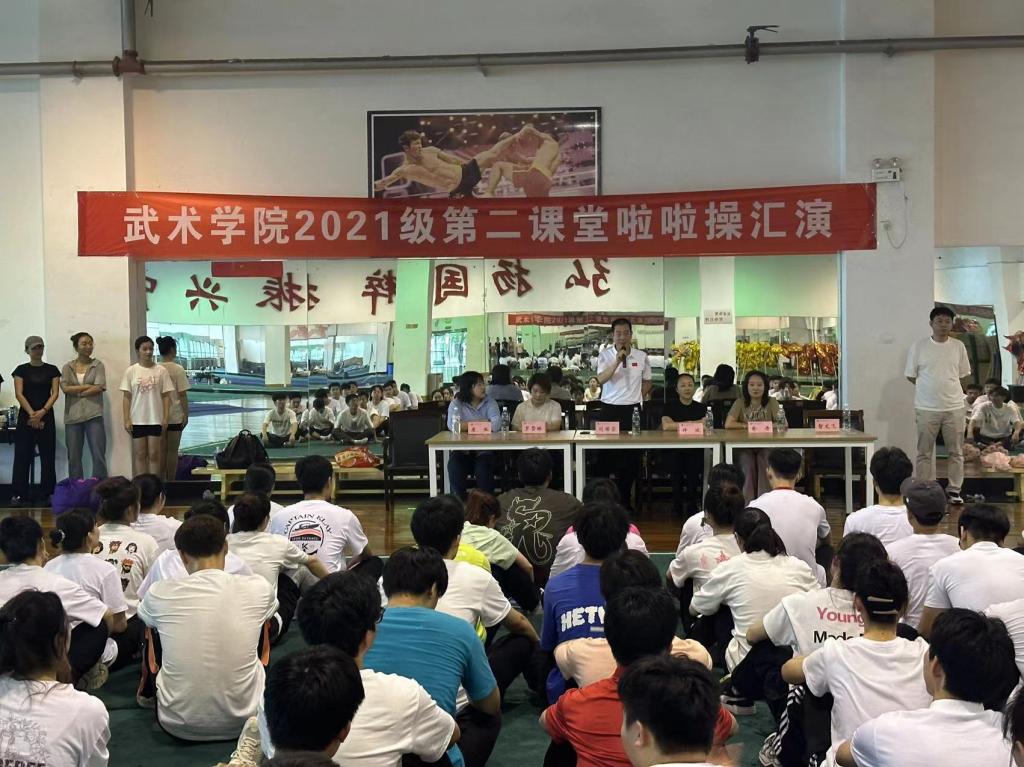 为了全面落实学校“十大改革工程”及学风建设,丰富学生课余生活,营造浓厚的校园文化氛围,发展学生兴趣特长,体现万象城的育人特色,培养学生的审美情趣。2024年6月20日下午5时,武术学院在套路馆召开了“武术学院2021级第二课堂啦啦操汇报表演”。参加活动的有武术学院院务会成员、指导教师许波、俞丹以及2021级全体学生。