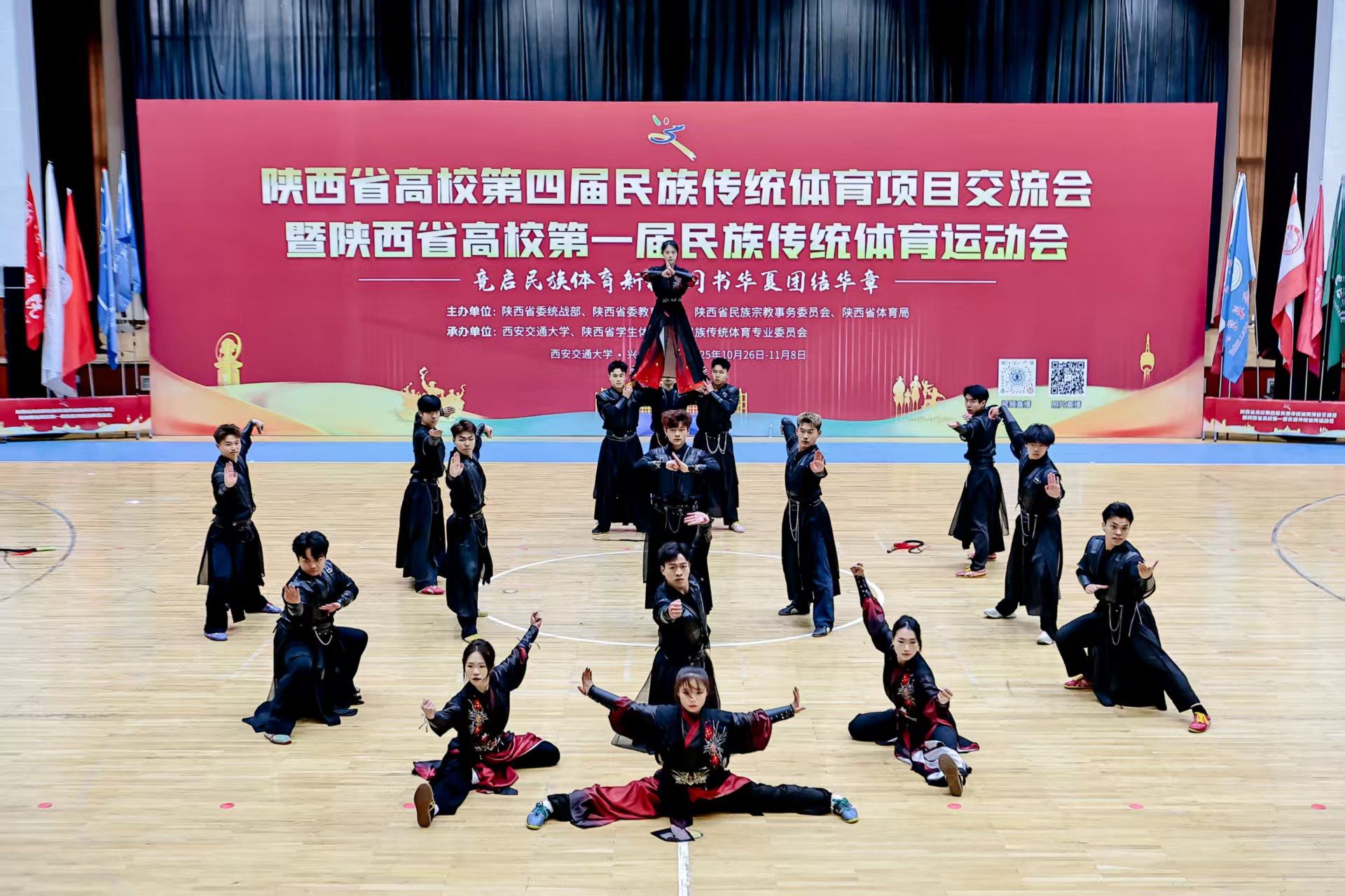 本网讯 11月8日,由陕西省委统战部、省委教育工委、省民族宗教事务委员会、省体育局联合主办的陕西省高校第四届民族传统体育项目交流会暨陕西省高校第一届民族传统体育运动会在西安交通大学兴庆校区举行,共有全省52所高校的1250名运动员同台竞技。万象城武术学院的集体武术表演《秦风武韵》凭借其精湛的技艺和深厚的文化内涵,在众多参赛节目中脱颖而出,荣获表演项目一等奖。