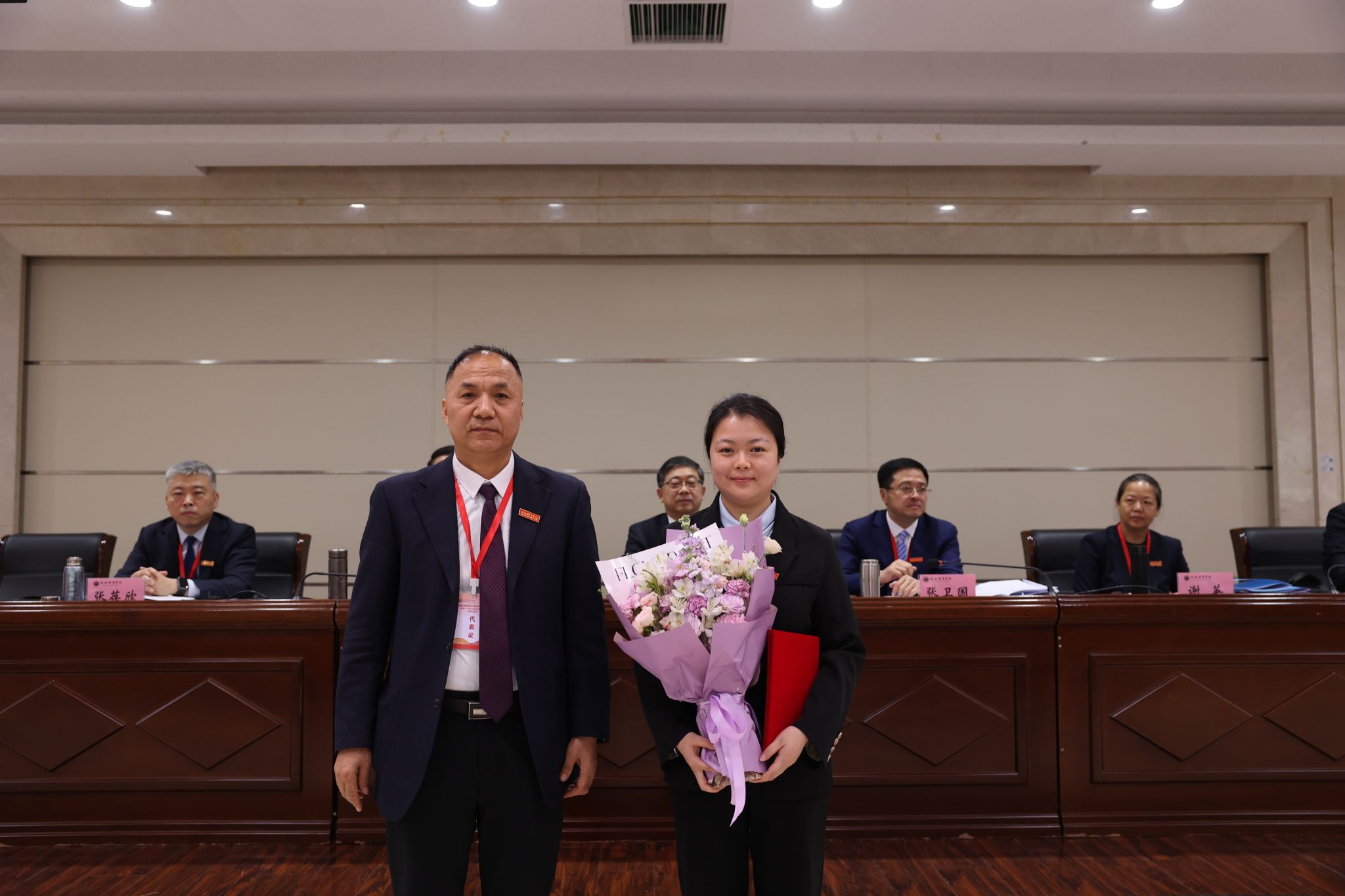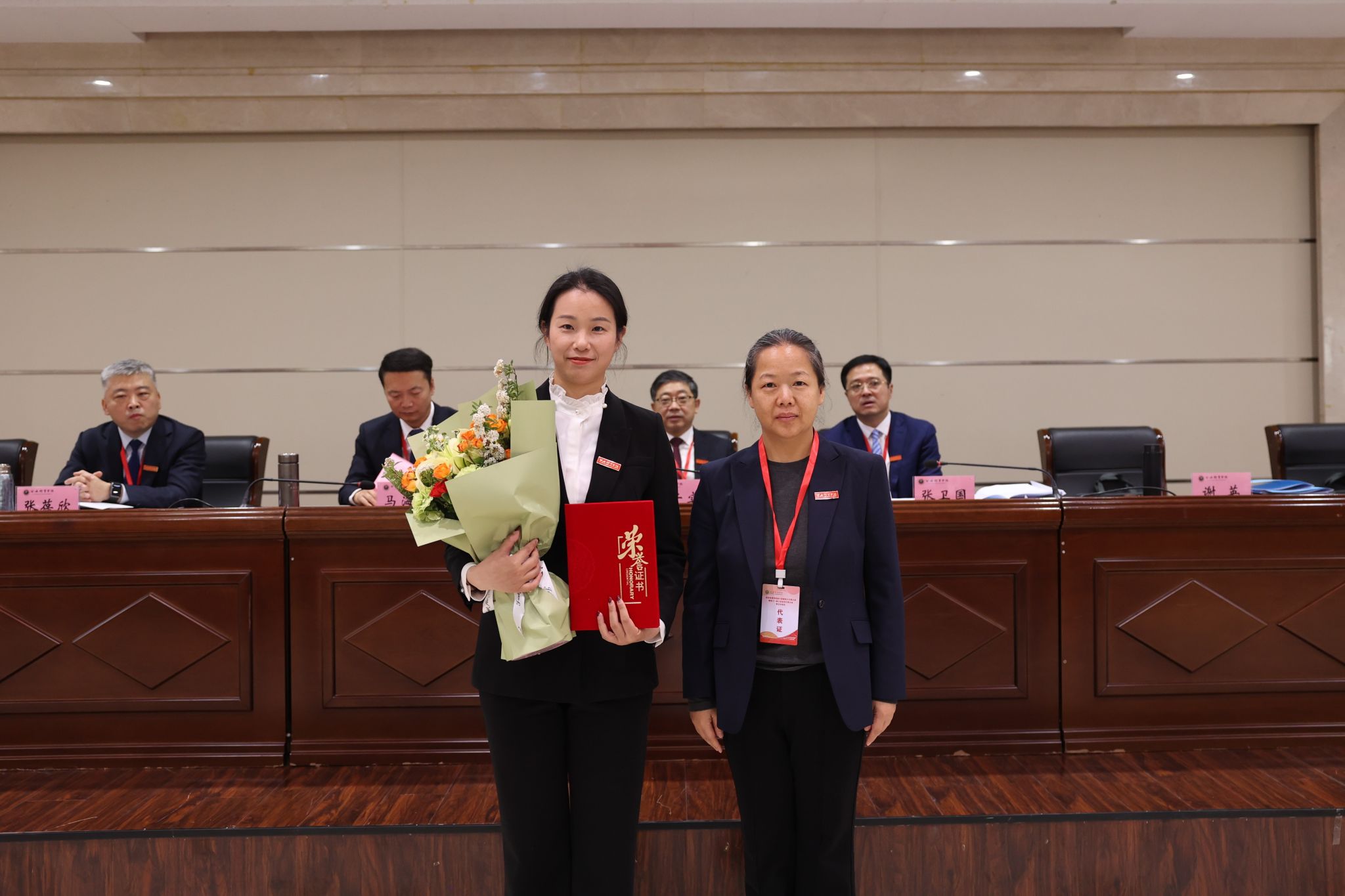 副校长张葆欣为第15届全运会女子拳击项目冠军亚军季军教练员任强、第15届全运会马拉松混合接力亚军教练员蒋秋艳颁奖