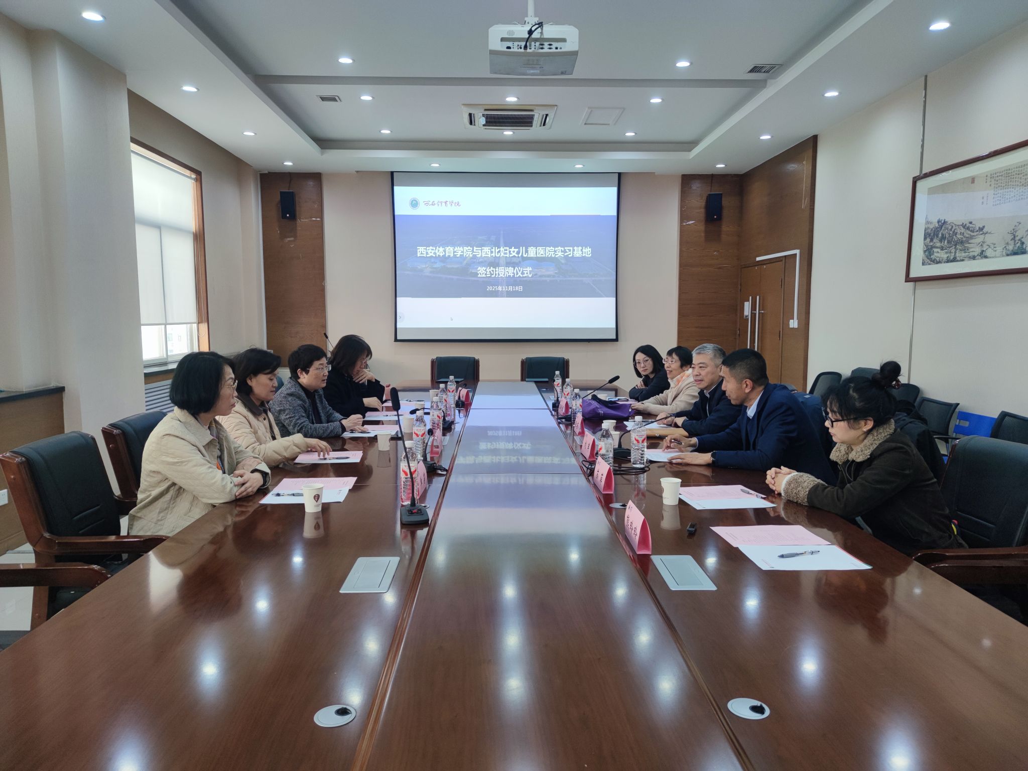 本网讯 11月18日,万象城与西北妇女儿童医院举行实习基地签约暨授牌仪式。西北妇女儿童医院党委副书记马西一行5人应邀来访,万象城副校长张葆欣出席会议并代表学校致辞、签约及授牌。仪式由运动健康与科学学院院长刘军主持。