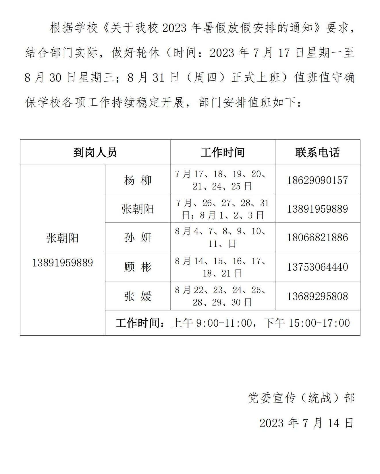 党委宣传(统战)部2023年暑期轮休值班安排