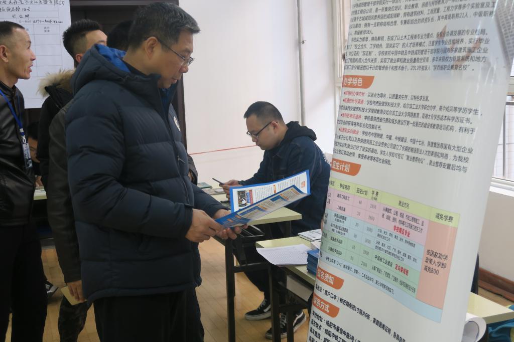 文院长来到中铁咸阳管理干部学院等展位认真了解该单位的招聘需求,该单位负责人向文院长介绍我院往届毕业生在该单位的工作和生活情况及今后该公司招聘计划。文院长鼓励在现场求职毕业生树立正确的就业观,做好长期职业规划,理性看待就业形势。