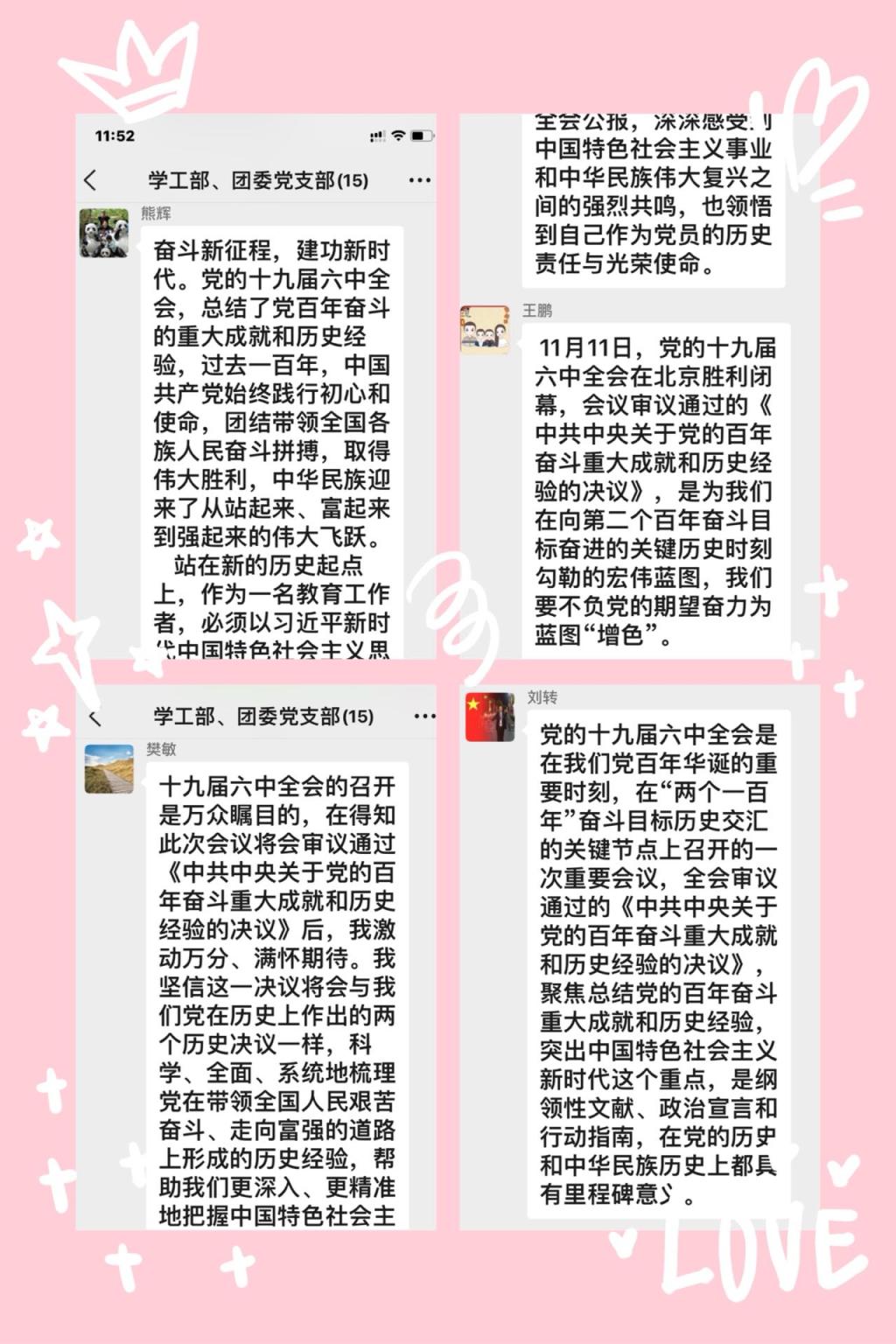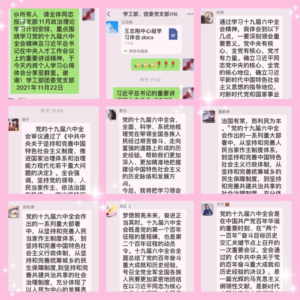按照学校党委宣传部及机关党委关于2021年11月政治理论学习的总体部署,结合学工部、团委近期工作实际,支部制定了本月政治理论学习计划,明确了学习任务,提出了具体要求。11月22日,全体党员在完成本月学习任务的同时,重点围绕学习宣传贯彻党的十九届六中全会精神开展了网上交流研讨活动。