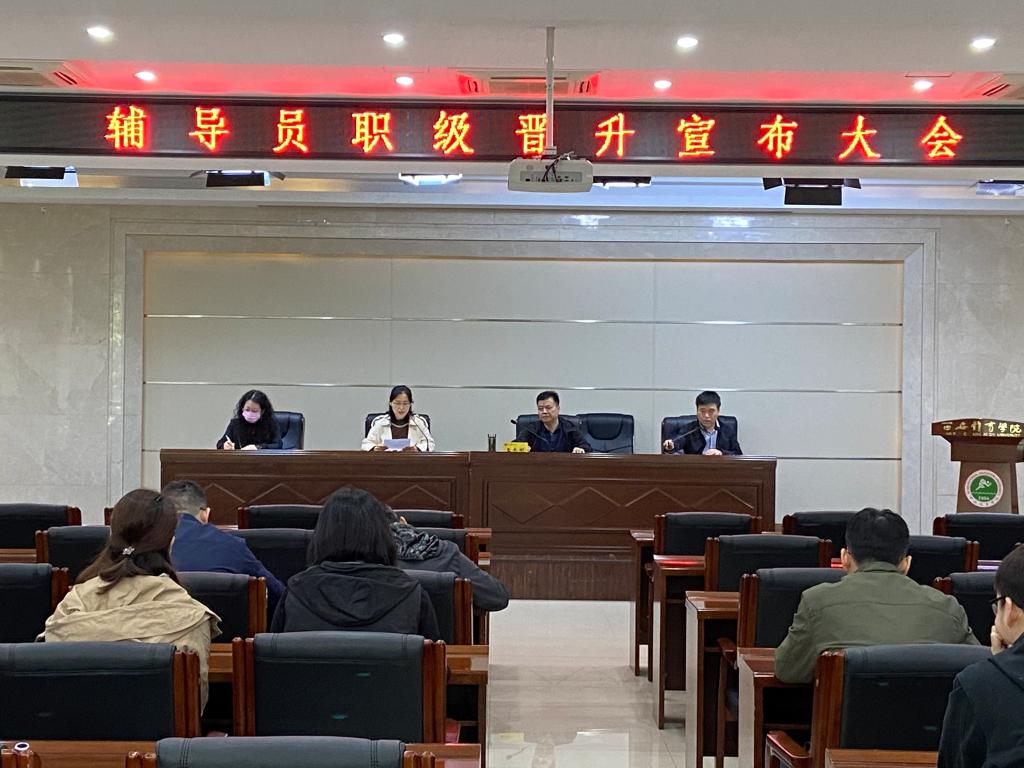 4月28日上午8:30,学工部在2号行政楼6楼会议室召开辅导员职级晋升宣布大会,学工部部长王志刚,学工部副部长樊敏,学工部副部长张娟,组织部(党校)干部科科长李志杰,全体辅导员参加会议,会议由樊敏主持。