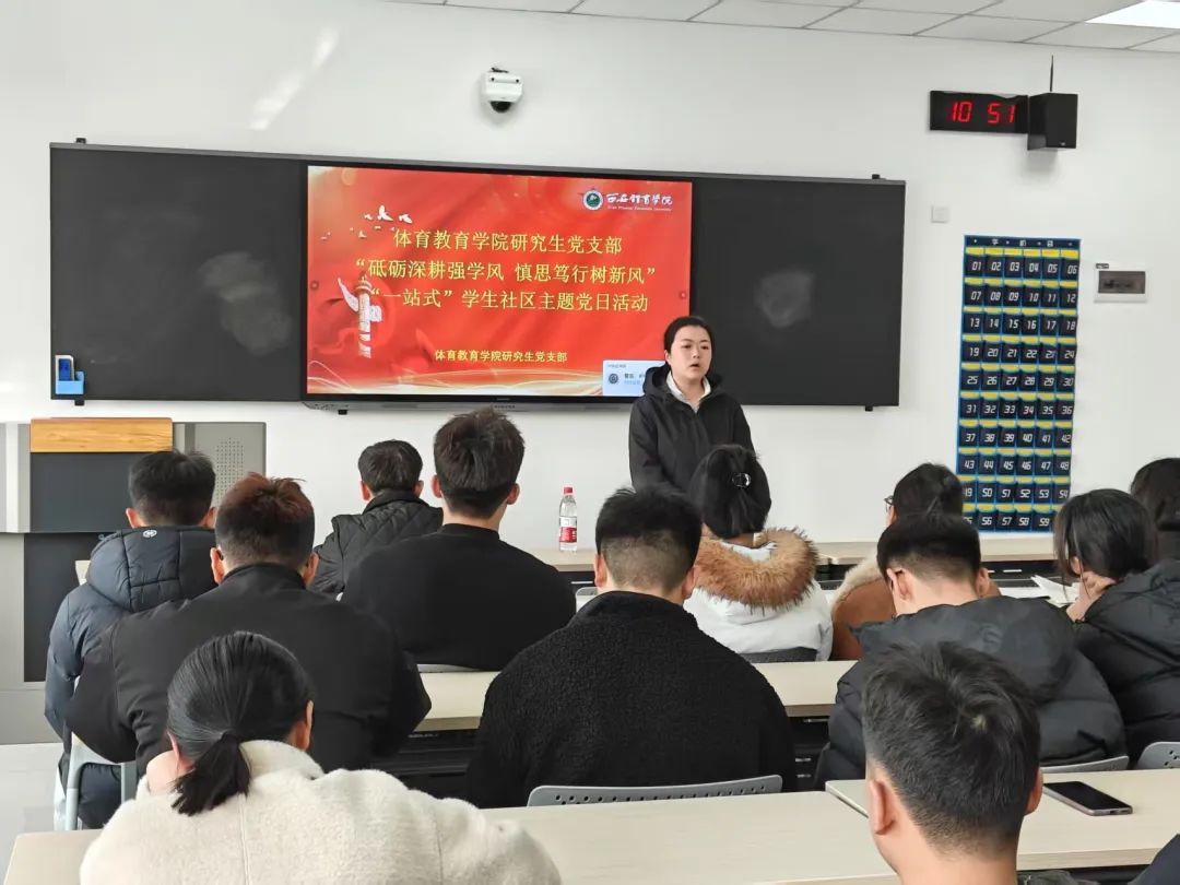 为充分发挥党组织在学风建设中的引领作用,凝聚党员力量营造积极向上的学习氛围,体育教育学院研究生党支部于3月5日上午在教学楼4举办 “砥砺深耕强学风 慎思笃行树新风”“一站式” 学生社区主题党日活动。