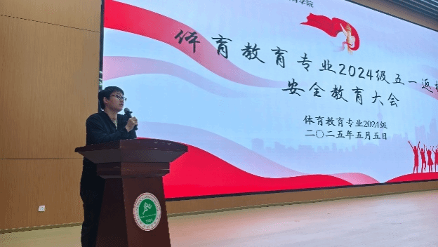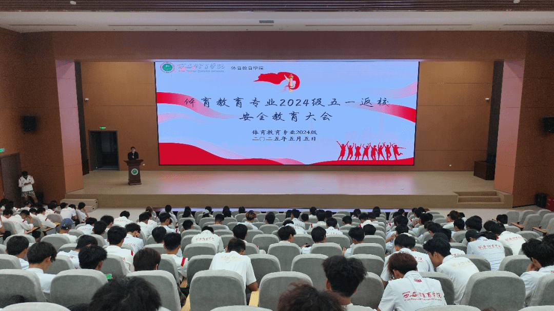为深入贯彻落实校园安全管理要求,进一步强化学生纪律意识,帮助同学们调整状态,以饱满的精神面貌投入后续学习生活,5月5日晚,体育教育专业2024级在万象城allwincity官网鄠邑校区学术报告厅组织召开“五一返校安全教育大会”。会议由体育教育专业2024级辅导员管融资、袁景峰主持,体育教育专业2024级全体学生参加。