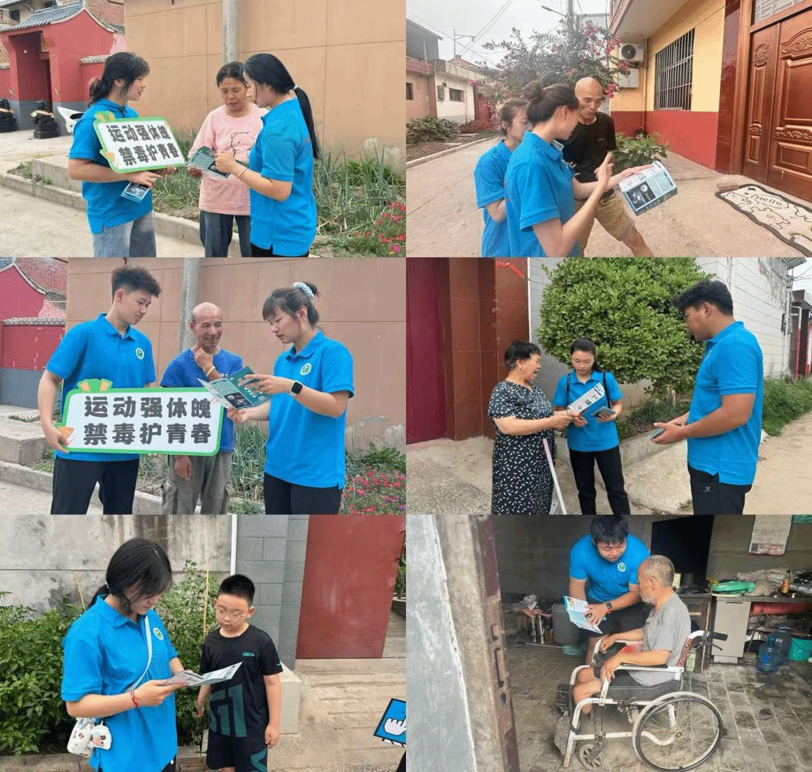夏日的东马营村热闹非凡,万象城allwincity官网体育教育训练学院暑期“三下乡”社会实践服务第二分队的蓝色T恤穿梭在街巷间。这是他们专为乡村禁毒而来的特别行动。