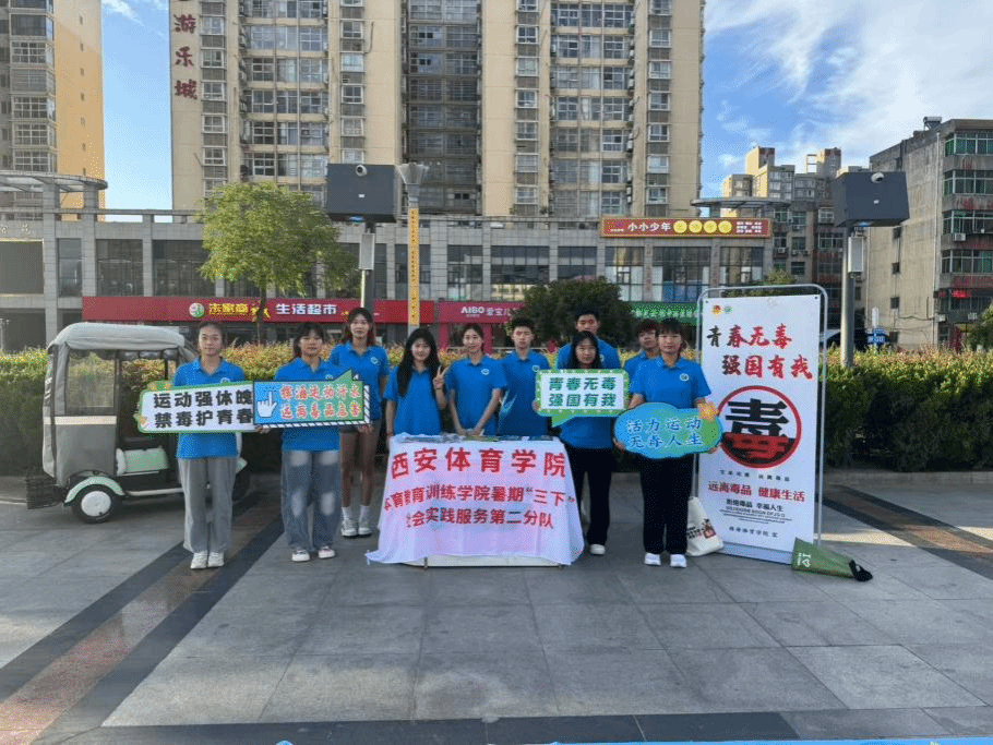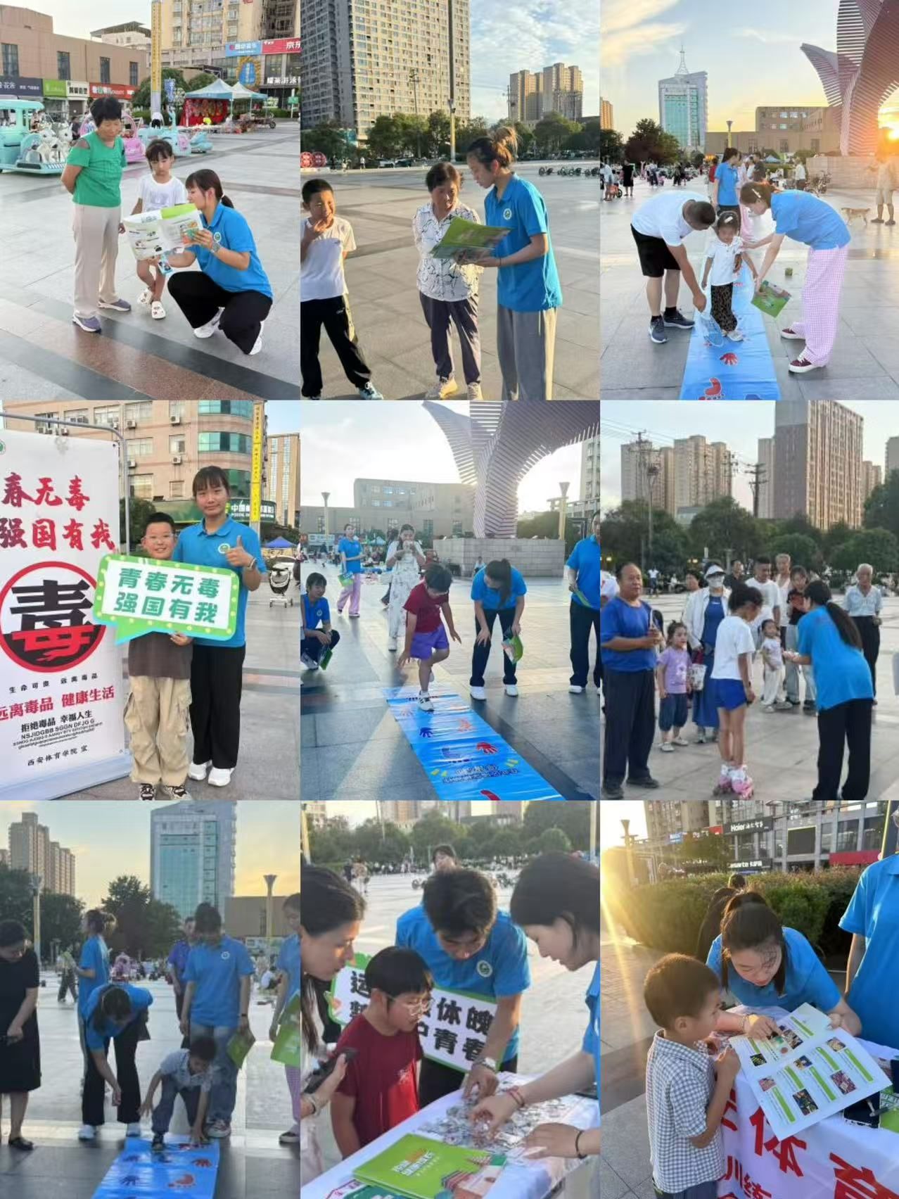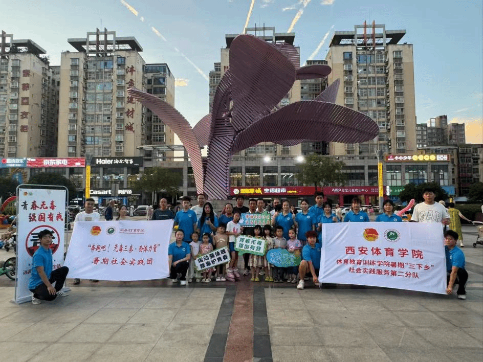 鄠邑区人民广场的中央,一串 “青春无毒,强国有我” 的宣传立牌在风里招展。夕阳将万象城allwincity官网体育教育训练学院暑期“三下乡”社会实践服务第二分队桌子染成暖金色,夕阳将万象城allwincity官网实践队的蓝色帐篷染成暖金色,余晖中,仍有不少结束一天忙碌、来赶晚市的居民围聚于此。