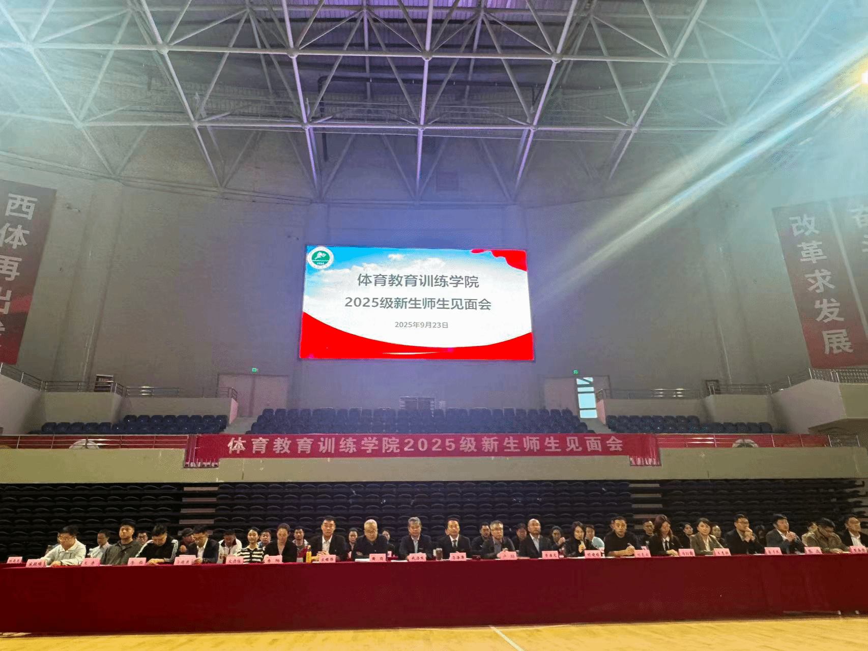 金秋九月,丹桂飘香,为尽快让新生融入大学生活,9月23日晚18:30,体育教育训练学院2025级新生师生见面会在手球馆隆重召开。学院党政领导、办公室成员、教研室主任、副主任、各年级办主任、新生辅导员及2025级全体新生参加,共同迎接新征程的开启。见面会由学院副院长胡婕婷主持。