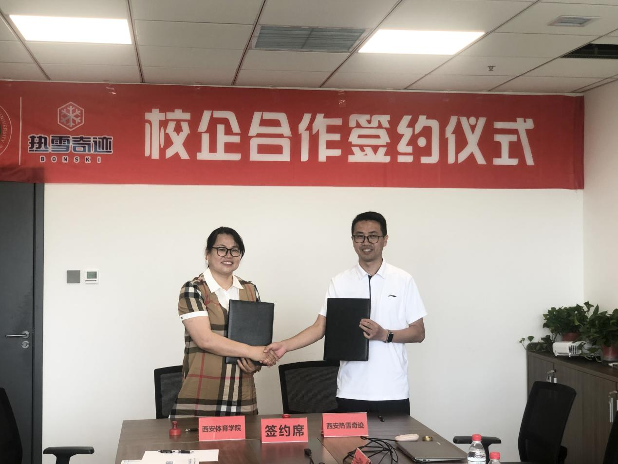6月21日,张卫国副校长带领鄠邑校区管委会、运动训练学院领导班子成员、各教研室主任及教师代表一行13人来到融创文旅旗下的西安热雪奇迹体育发展有限公司进行实地考察调研。校企双方就合作项目进行了深入充分的交流座谈,签署了“运动训练学院实习实训就业创业联盟”战略合作协议并予以授牌。西安热雪奇迹体育发展有限公司总经理陈志强、人力行政部经理禹洁、滑雪学校校长魏堂勇、自由式滑雪世界冠军滑雪学校总教练陈康等参加了此次签约仪式。