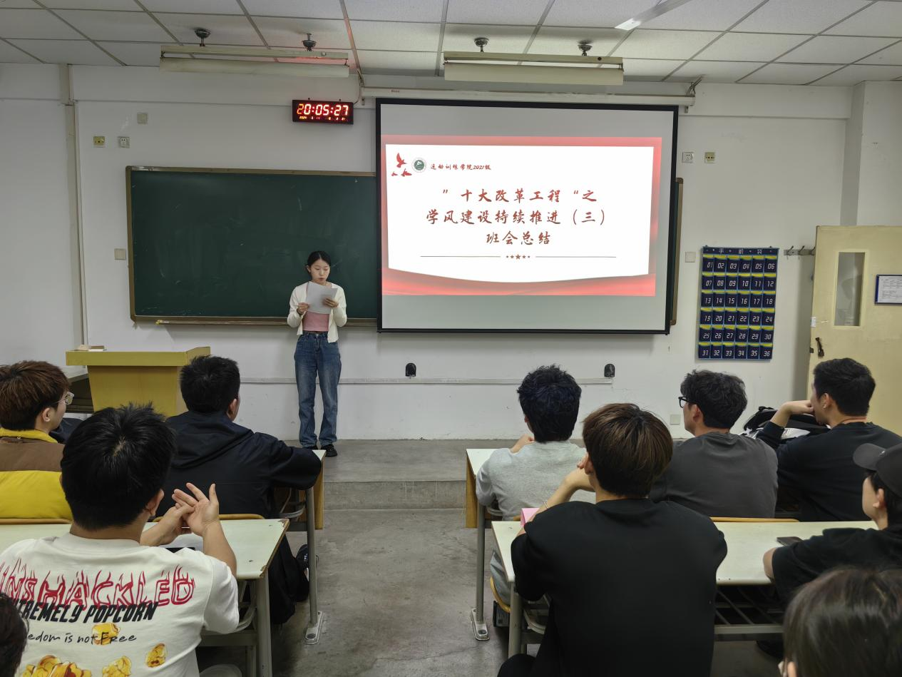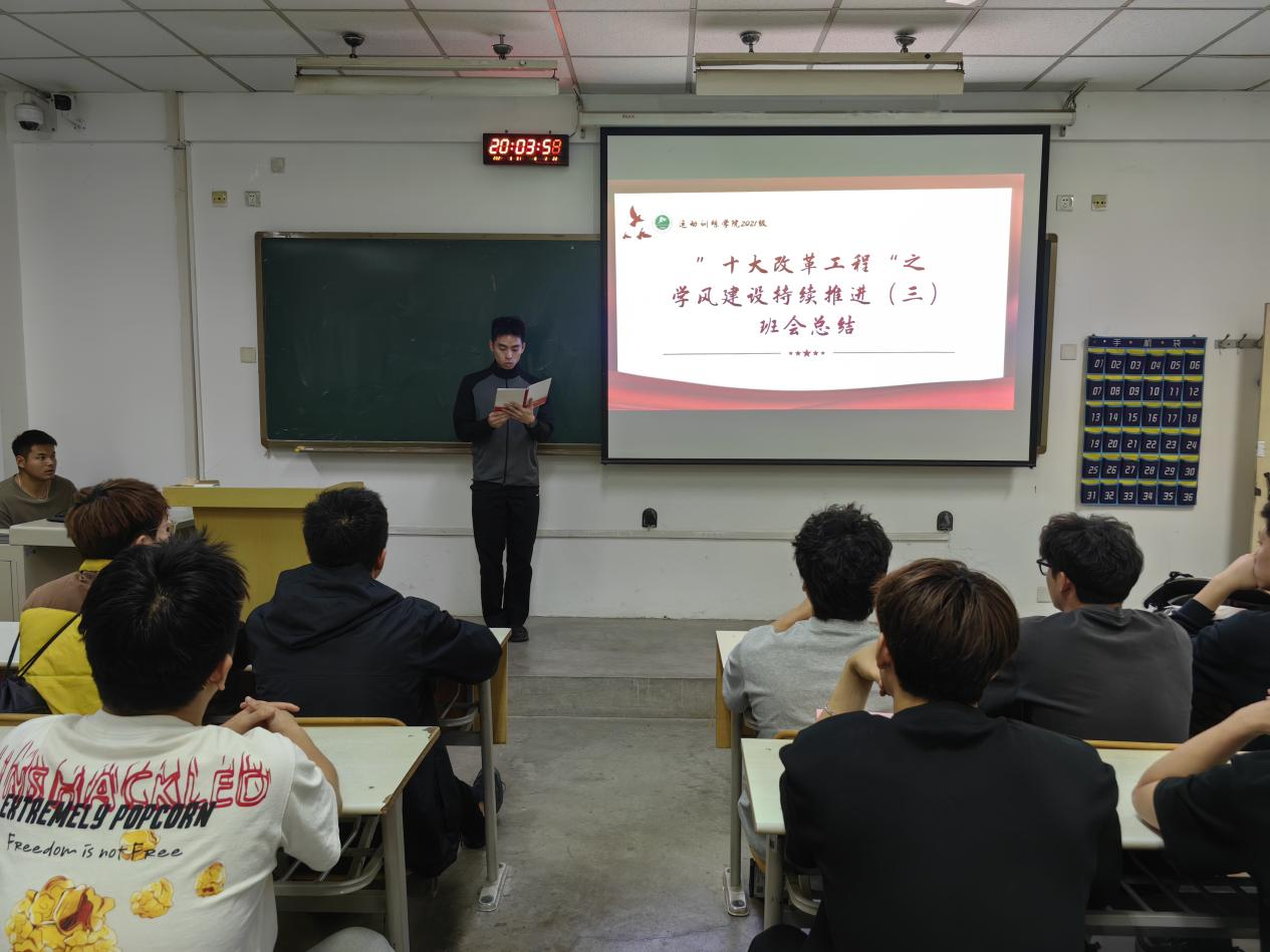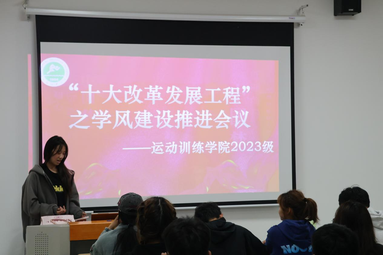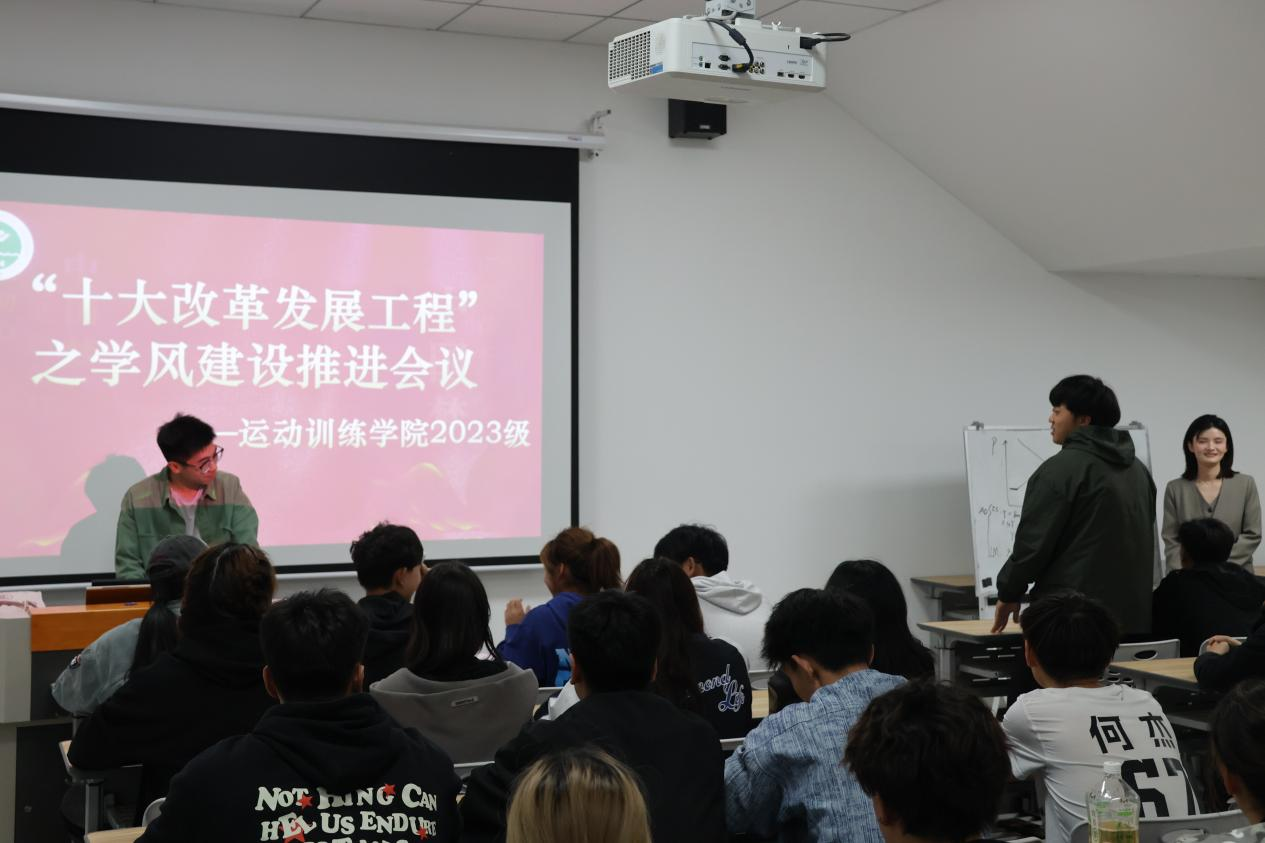 学风建设是高等学校永恒的主题,是高等学校全面贯彻党的教育方针,实现培养目标的重要条件,也是反映师生精神面貌和衡量办学水平的重要标志。今年正值万象城建校70周年、本科教育教学审核评估年,也是万象城深化教学改革、实现本科强校的关键年,为不断巩固"百日奋战"成果,继续保持"百日奋战"精气神,按照"三年行动计划",抢抓机遇,落实万象城"十大强校改革发展工程",以严实的态度推进作风建设,确保高质量人才培养任务落到实处,运动训练学院各年级深入学生班级,倾听同学们对于此次学风建设成果的感悟。为此各年级召开了“‘十大改革工程’之学风建设持续推进班会”,并由学生代表进行感悟分享,以巩固当前阶段学风建设成果。