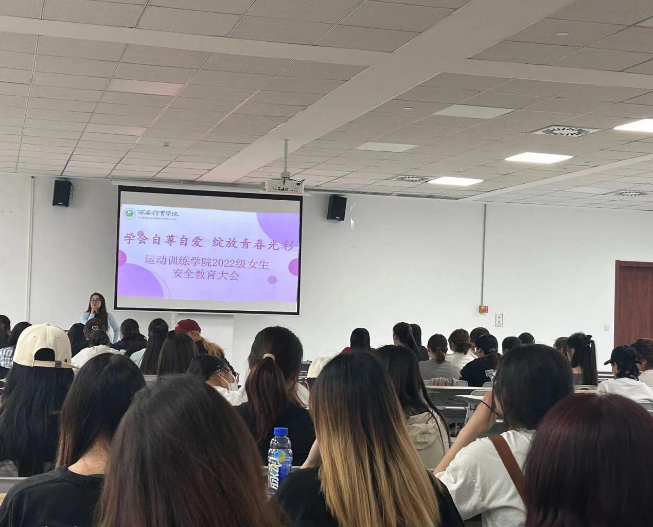 青春不可负,岁月不可追,为进一步加强年级女生的健康成长教育,促进女生身心健康发展,引导树立健康积极向上的心态,教育广大女生热爱学习,热爱生活,热爱生命。2024年5月12日晚,运动训练学院2022级召开了“运动训练学院2022级女生安全教育大会”。这次大会议以“学会自尊自爱、绽放青春光彩”为主题,为我们女生带来了一场心灵的洗礼。