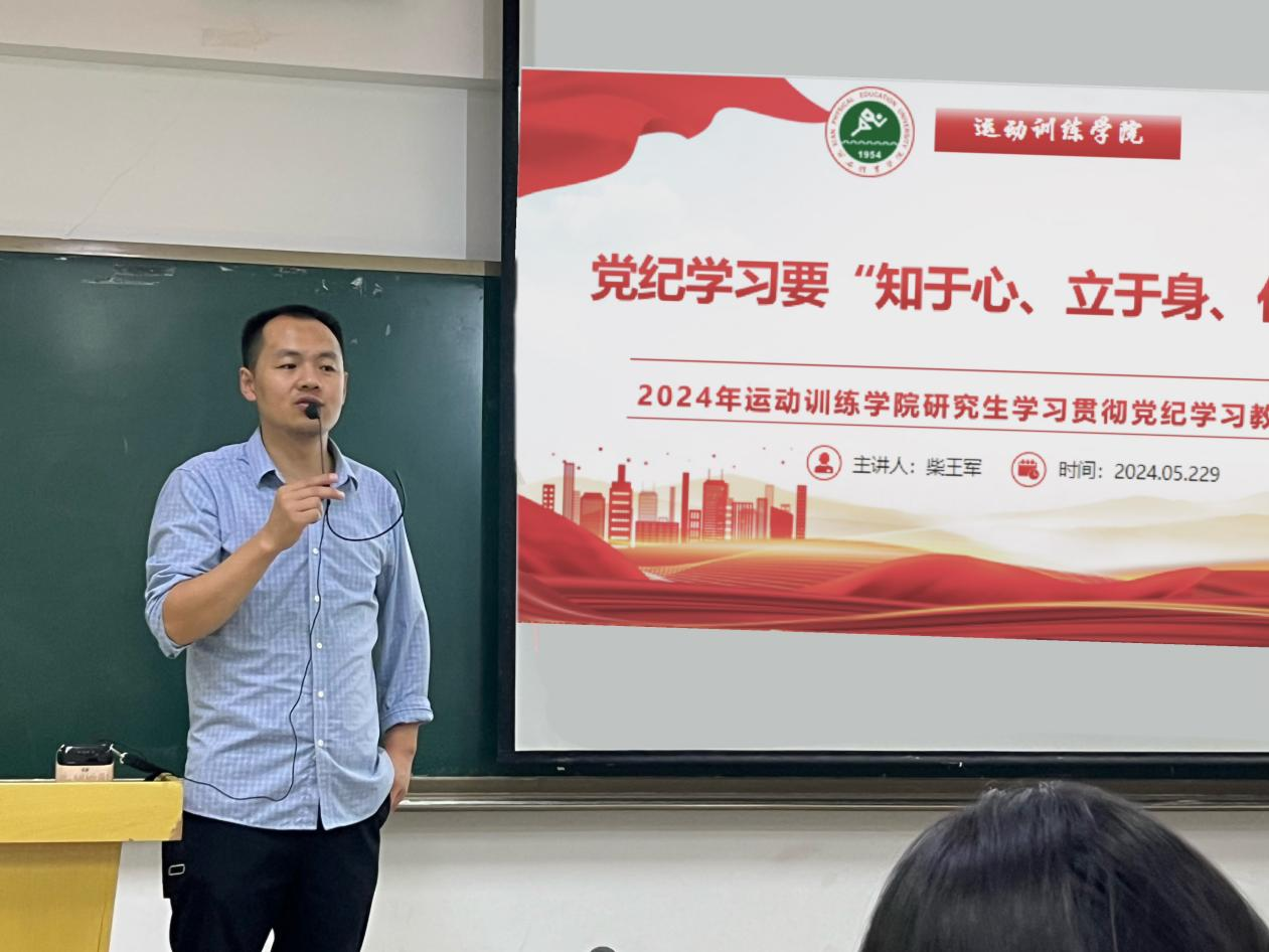 为进一步深化学生党员的党纪学习教育,培养担当民族复兴大任的时代新人。5月29日,运动训练学院副院长柴王军在含光校区教学楼102教室开展以“党纪学习要‘知于心、立于身、化于行’”为主题的专题党课。运动训练学院全体研究生党员参加本次专题党课。