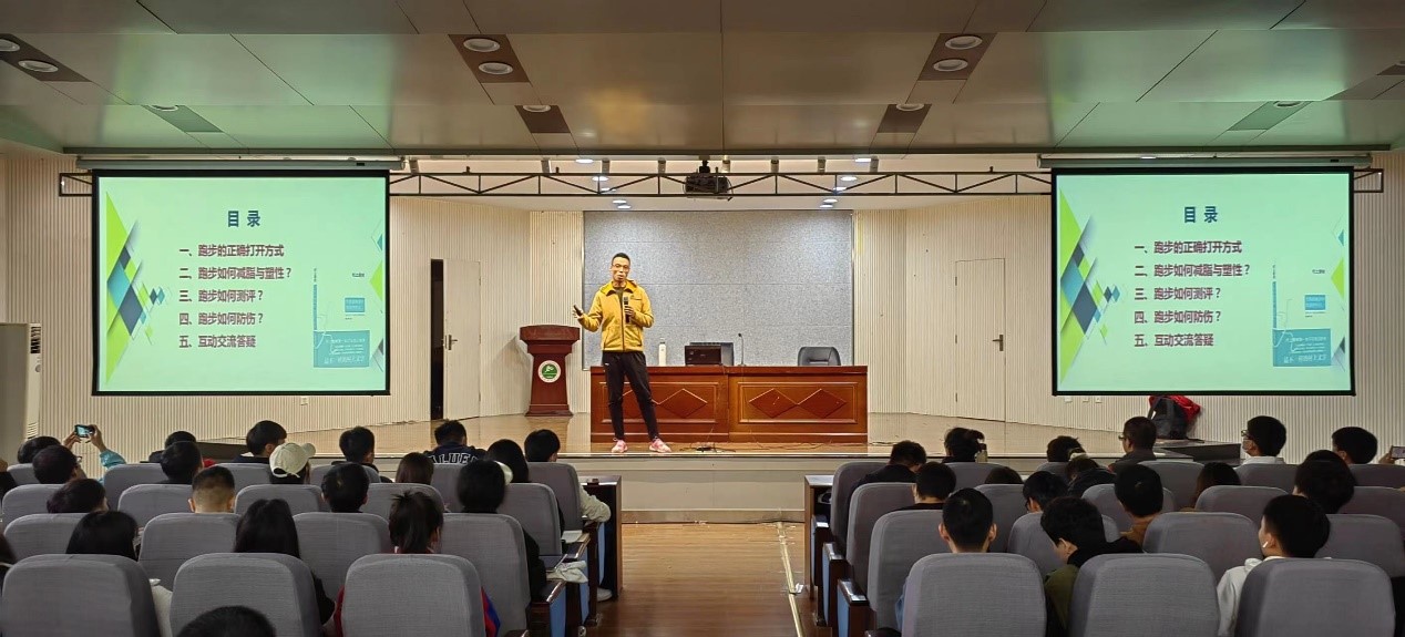 此次学术讲座,使同学们进一步了解跑步的好处以及正确的跑步姿势,以视频的方式讲解了几种常见的错误跑步方式,并进行了纠正。同时给同学们演示了“yo-yo跑步测评法”。报告结束后,谭玉容老师邀请同学们与李老师进行精彩的互答环节。