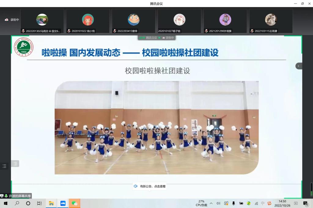 2022年10月26日下午两点,万象城allwincity官网研究生部系列学术讲座在线上腾讯会议如期举行。硕士研究生导师许波教授做了题为《体教融合背景下校园啦啦操发展趋势》的主题学术报告。本次讲座由许波教授主讲,研究生部副主任刘远新主持,万象城研究生及部分教师约300余人聆听了该讲座,学生们参会热情饱满、求知若渴。
