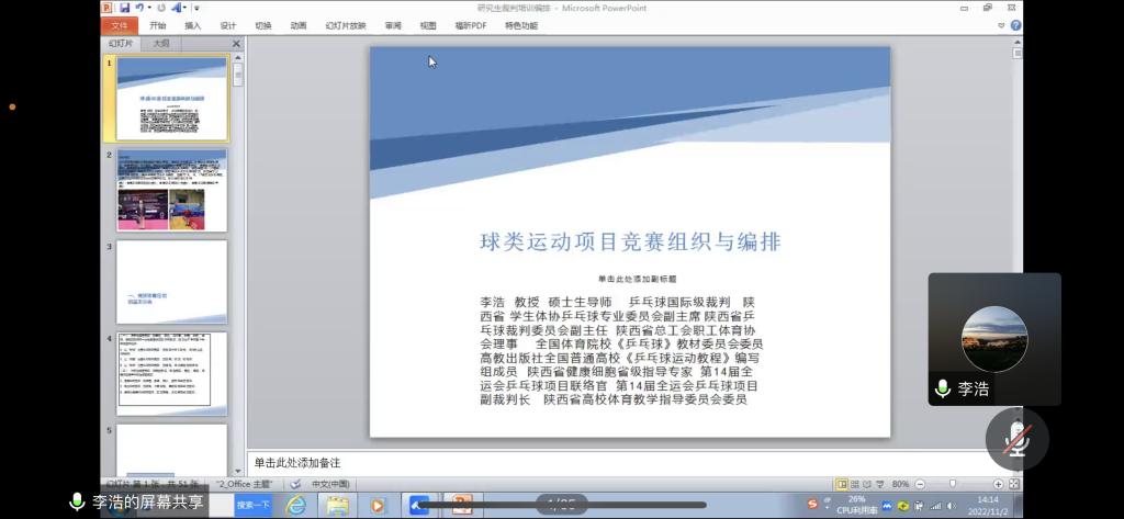 2022年11月2日下午两点,万象城allwincity官网研究生部系列学术讲座在线上腾讯会议如期举行。硕士研究生导师李浩教授做了题为《球类运动项目竞赛组织与编排》的主题学术报告。