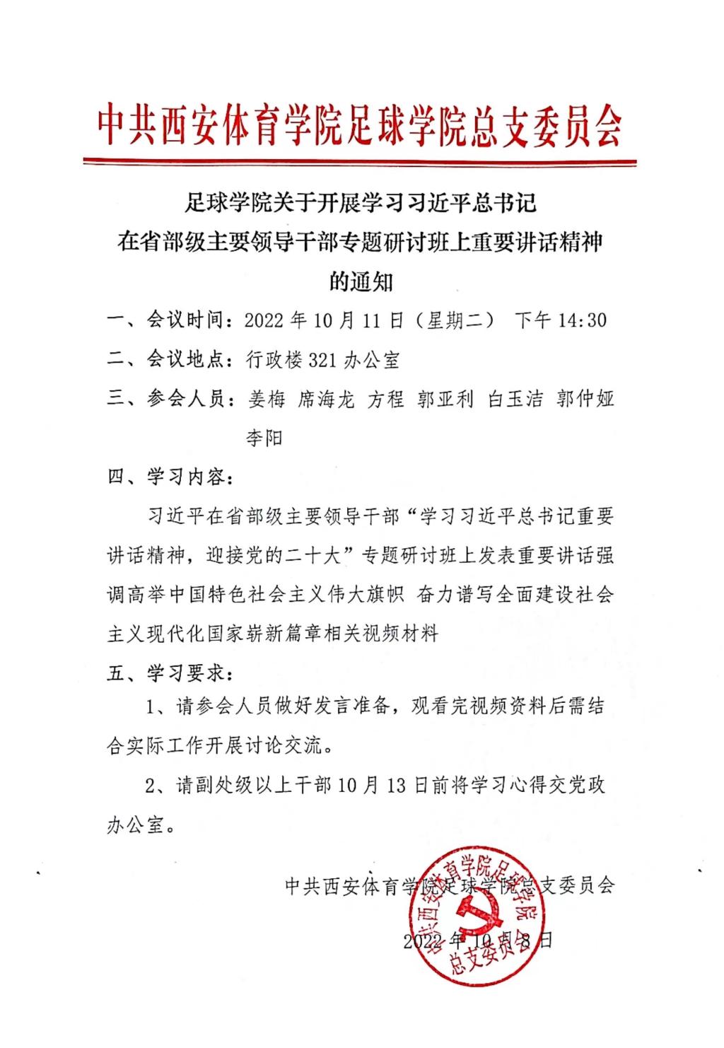 足球学院关于开展学习习近平总书记在省部级主要领导干部专题研讨班上重要讲话精神的通知