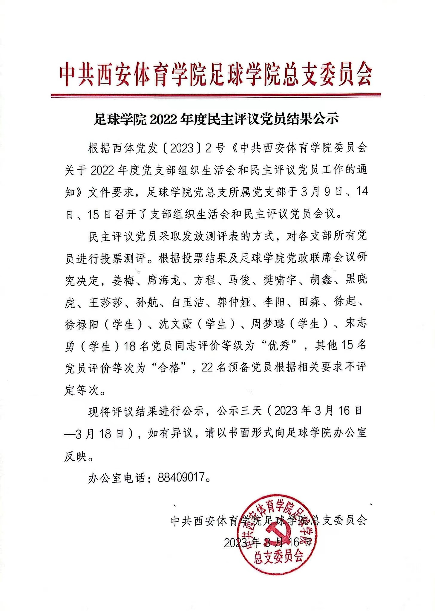 足球学院2022年度民主评议党员结果公示