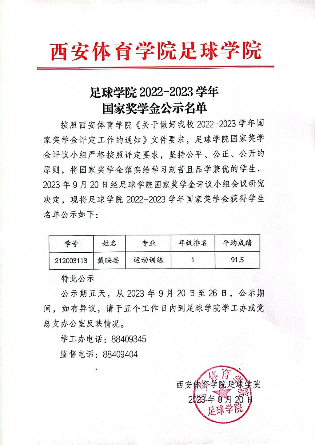 足球学院2022-2023学年国家奖学金公示名单