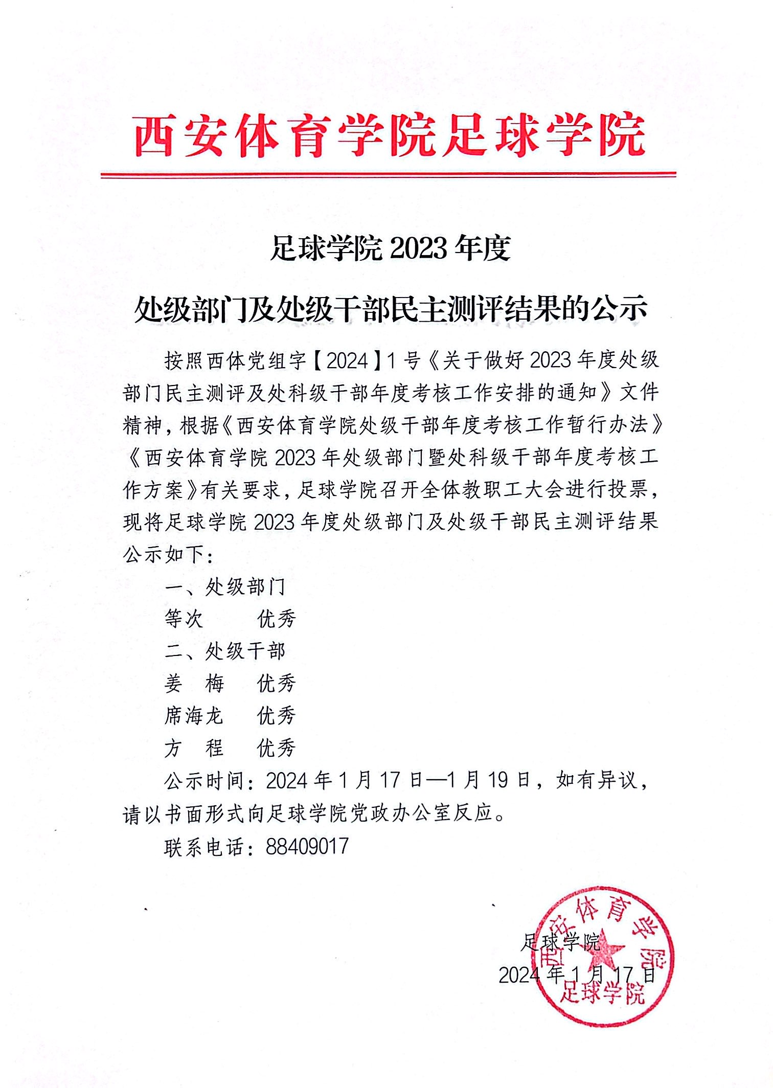 足球学院2023年度处级部门及处级干部民主测评结果的公示