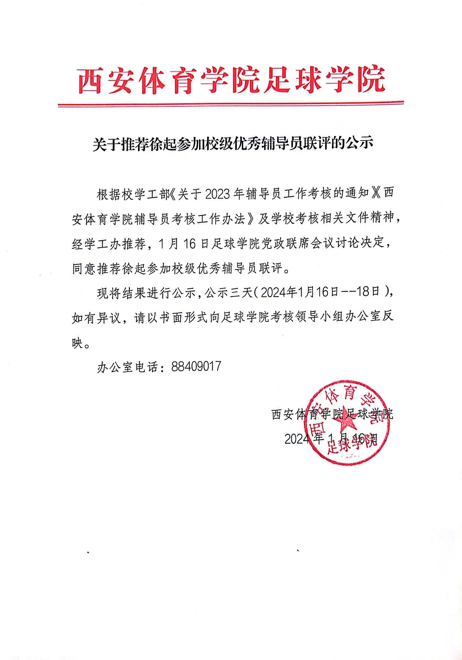 关于推荐徐起参加校级优秀辅导员联评的公示