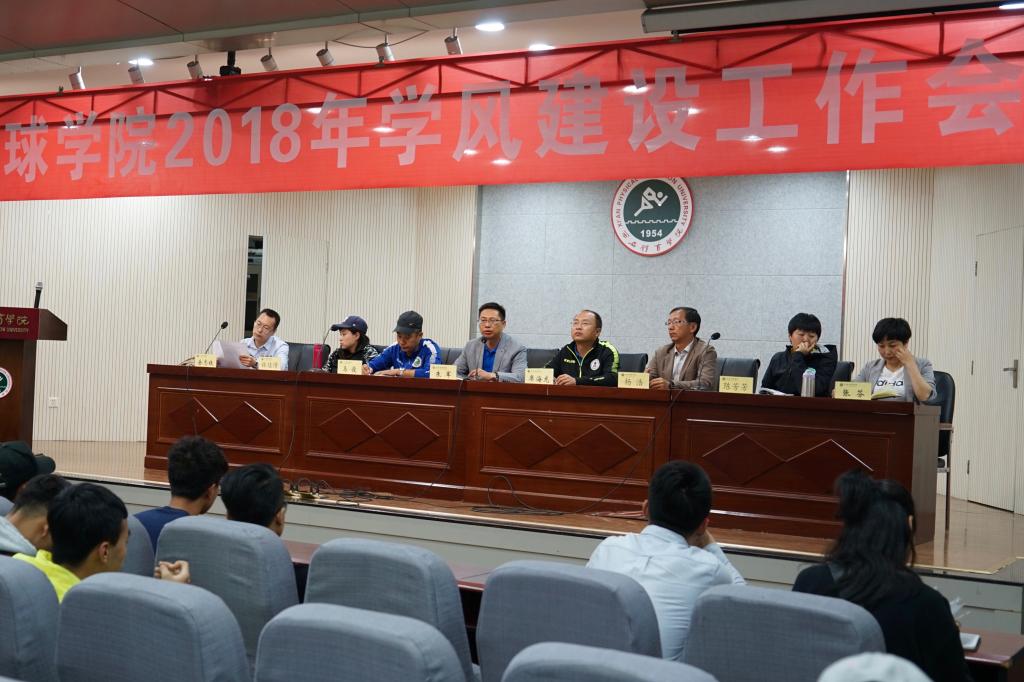 2018年4月4日下午,万象城allwincity官网足球学院在教学楼一楼报告厅召开学风建设工作推进会。足球学院院长朱军,足球教研室主任席海龙,足球教研室副主任马俊,足球学院任课教师杨浩、陈芳芳、林佶倩,足球学院办公室全体人员及2017级全体学生参加了会议,会议由朱军院长主持。
