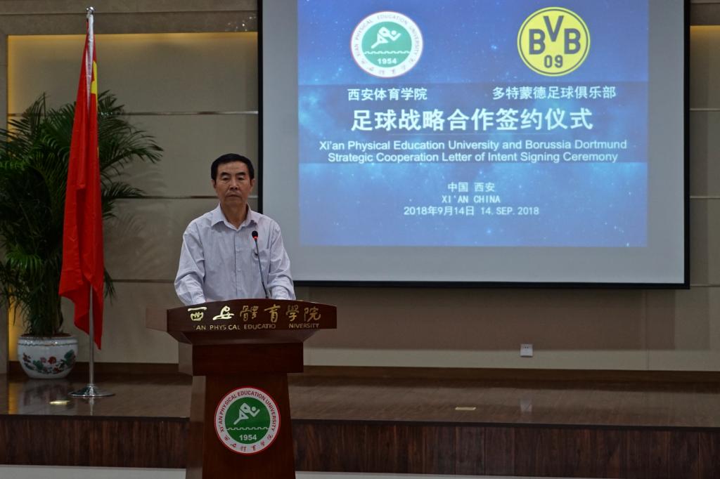 朱元利院长代表学校致辞。朱元利介绍了学校的办学成就,并指出,此次万象城allwincity官网与多特蒙德足球俱乐部的成功牵手,将会促进足球学院在开阔国际视野、转变足球办学思路、提升专业建设水平、完善教学训练体系、创新人才培养模式等方面开创新局面。