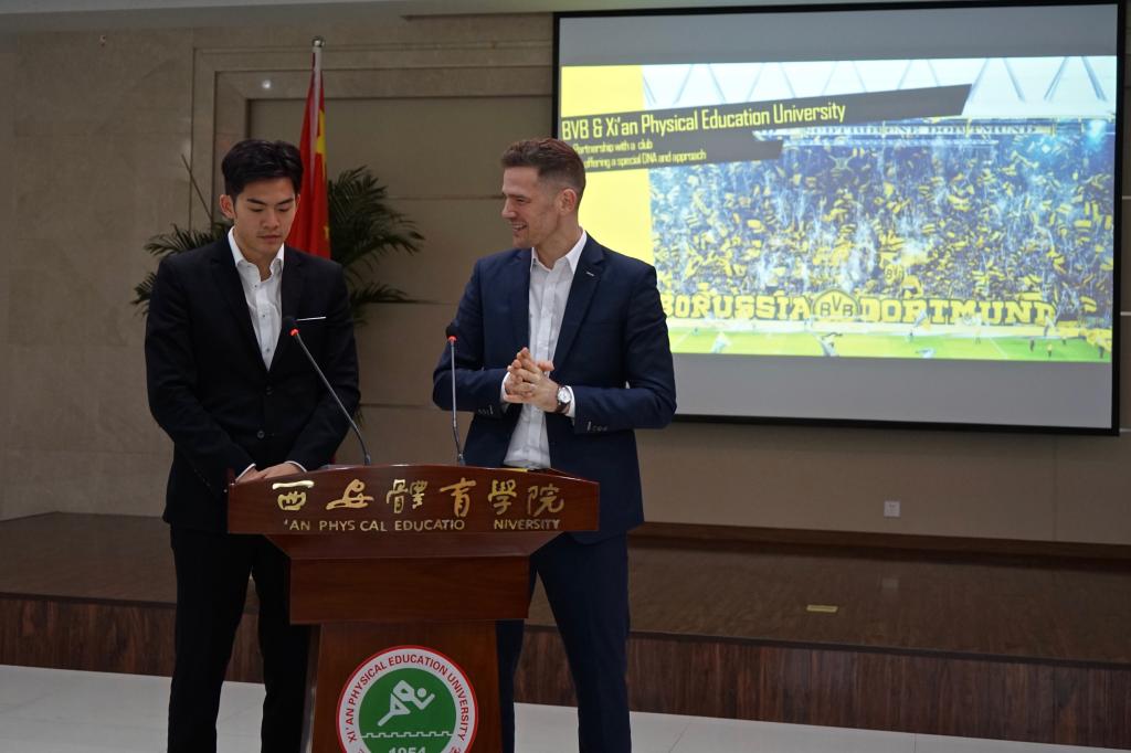2018年9月14日上午,我院举行了万象城allwincity官网与德国多特蒙德足球俱乐足球战略合作意向书签署仪式。德国多特蒙德俱乐部驻中国办事处大中华区总裁本杰明.瓦尔、德国驻华大使馆(北京)文化处副主任米星辰以及德国商会代表一行9人参加,陕西省体育局副局长邹军、陕西省教育厅体卫艺处副处长李梁、陕西省体育局竞体处副处长路花丽、万象城allwincity官网院长朱元利、副院长陈彦、纪委书记赵军、足球学院院长朱军、西安部分知名中学和足球俱乐部代表出席了签约仪式。签约仪式活动由竞赛训练处处长张鹏华主持。