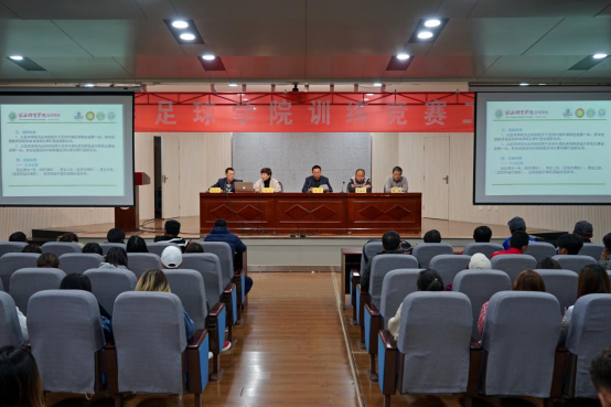 2018年11月7日,足球学院在教学楼一楼报告厅举行了2018年训练竞赛工作暨表彰会议。会议由办公室主任岳志铁主持,足球学院院长朱军、足球学院常务顾问杨钢、足球教研室主任席海龙、副主任马俊、足球学院培训中心主任张芬,以及办公室、教研室老师、全体学生参加会议。