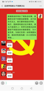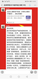 【五】在面对新冠肺炎疫情防控严峻形势情况下,校领导赵军书记和老师们通过小视频给学生们的寄语,在2020年这个注定不平凡的春节里,带给同学们温暖和感动,教会了同学们责任和担当,也坚定了足球学院师生抗疫的信心!