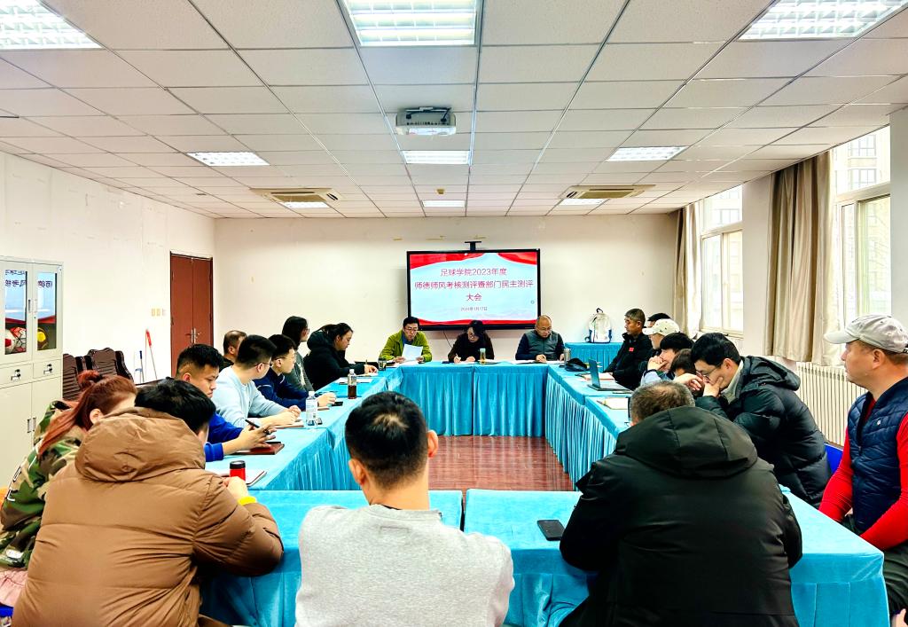 1月17日下午,足球学院在二号行政楼406会议室召开2023年度师德师风考核测评暨部门民主测评大会,全体教职工参会,会议由党总支书记姜梅主持。