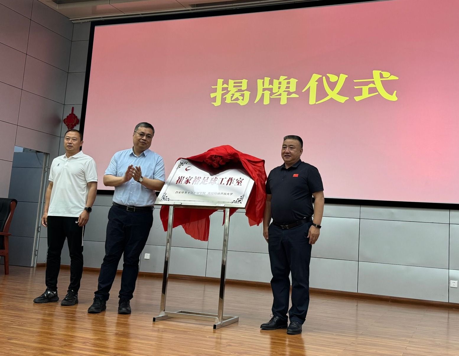 吕学宏一行首先前往克拉玛依开放大学,与克拉玛依市政府副秘书长张勇共同为克拉玛依开放大学崔家裕足球工作室揭牌,并与克拉玛依开放大学党委书记、校长绳志勇等开展座谈活动,双方就人才培养、实习就业、培训合作等方面进行了深入交流,签订合作协议。