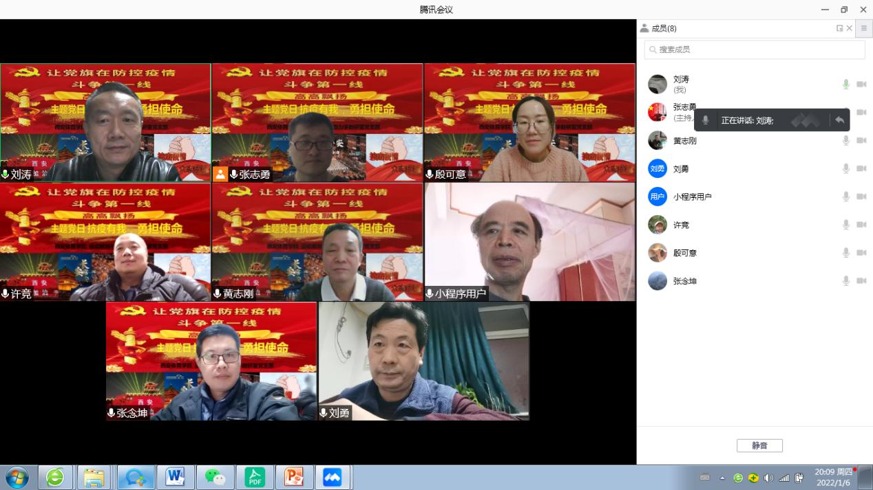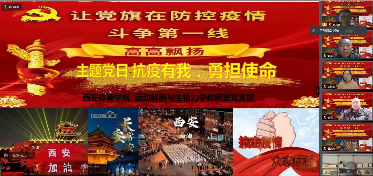 当前西安疫情持续发展,高校疫情防控形势严峻,防控任务艰巨复杂。为了更好地发挥支部在抗疫方面的战斗堡垒作用和党员先锋模范作用,2022年1月6日晚八点,运动解剖与力学教研室党支部召开了主题为“抗疫有我,勇担使命,”的线上主题党日活动。会议由支部书记刘涛主持,支部全体党员参加,运动与健康科学学院党委书记刘勇出席了本次会议。