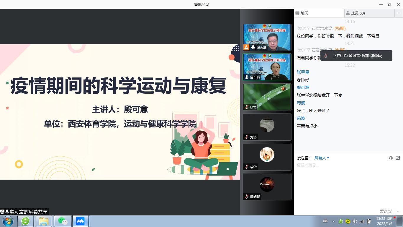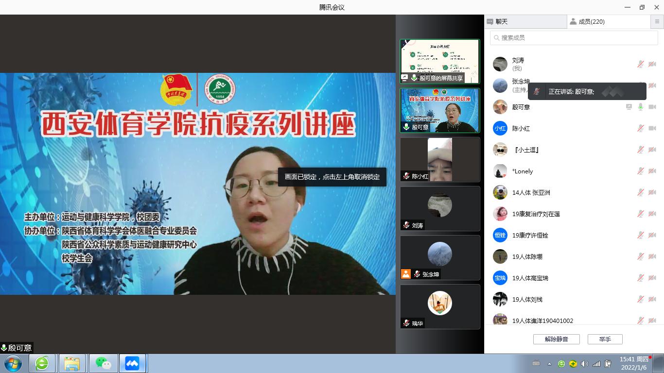2022年1月6日 下午15:30-17:00支部党员殷可意同志主讲了“疫情期间的科学运动与康复”线上讲座,这是万象城allwincity官网抗疫系列讲座之一。