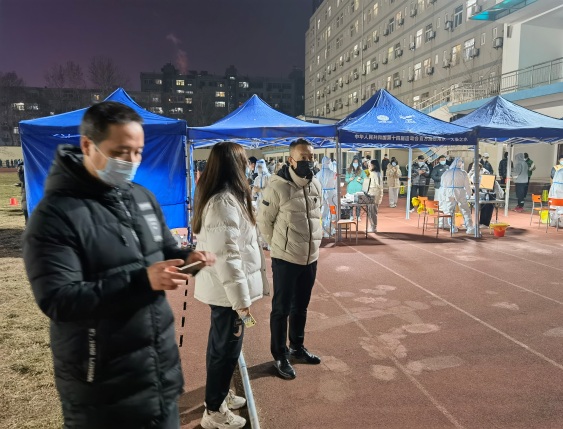 许竞和刘涛老师维持学生排队做核酸
